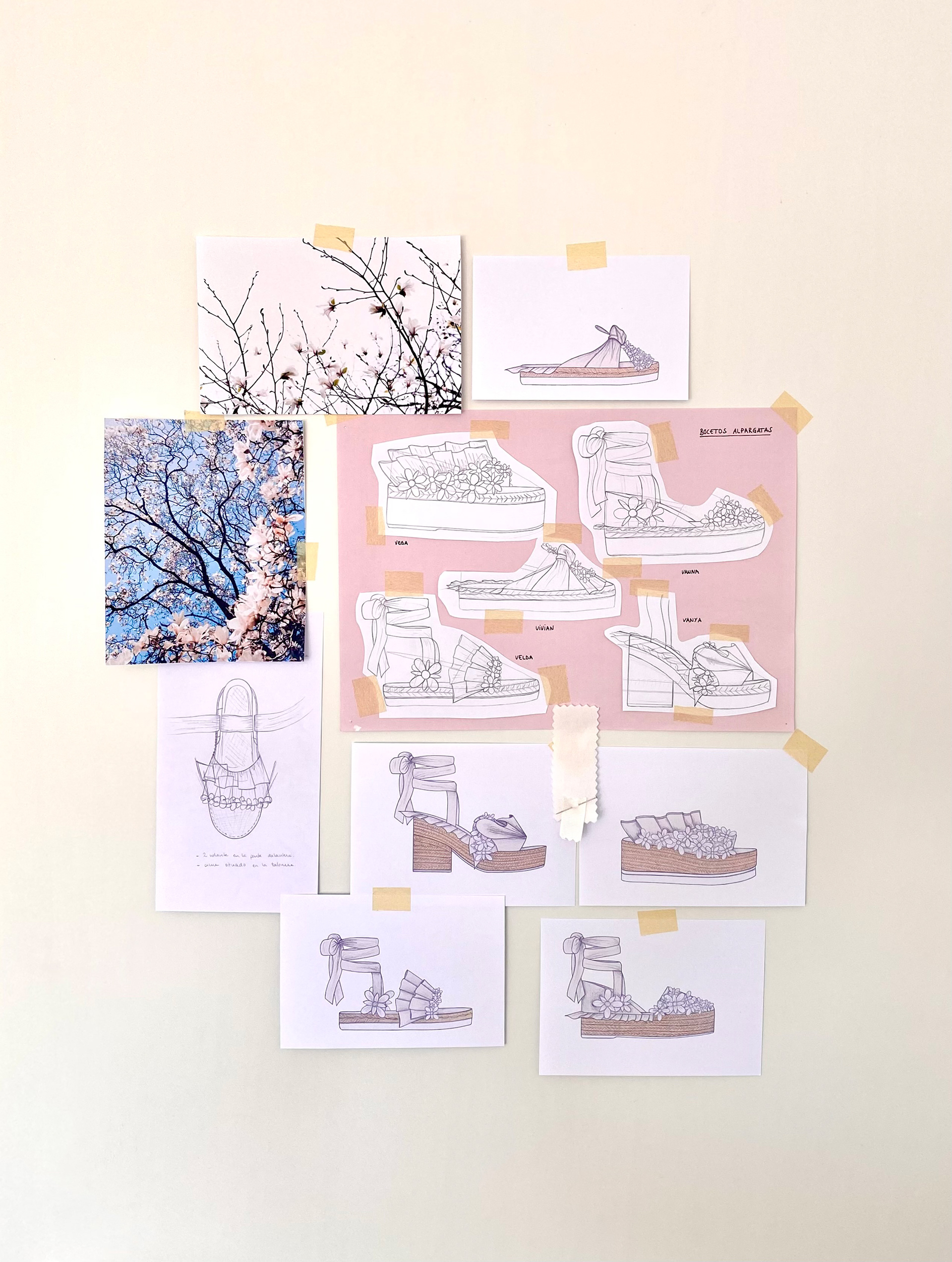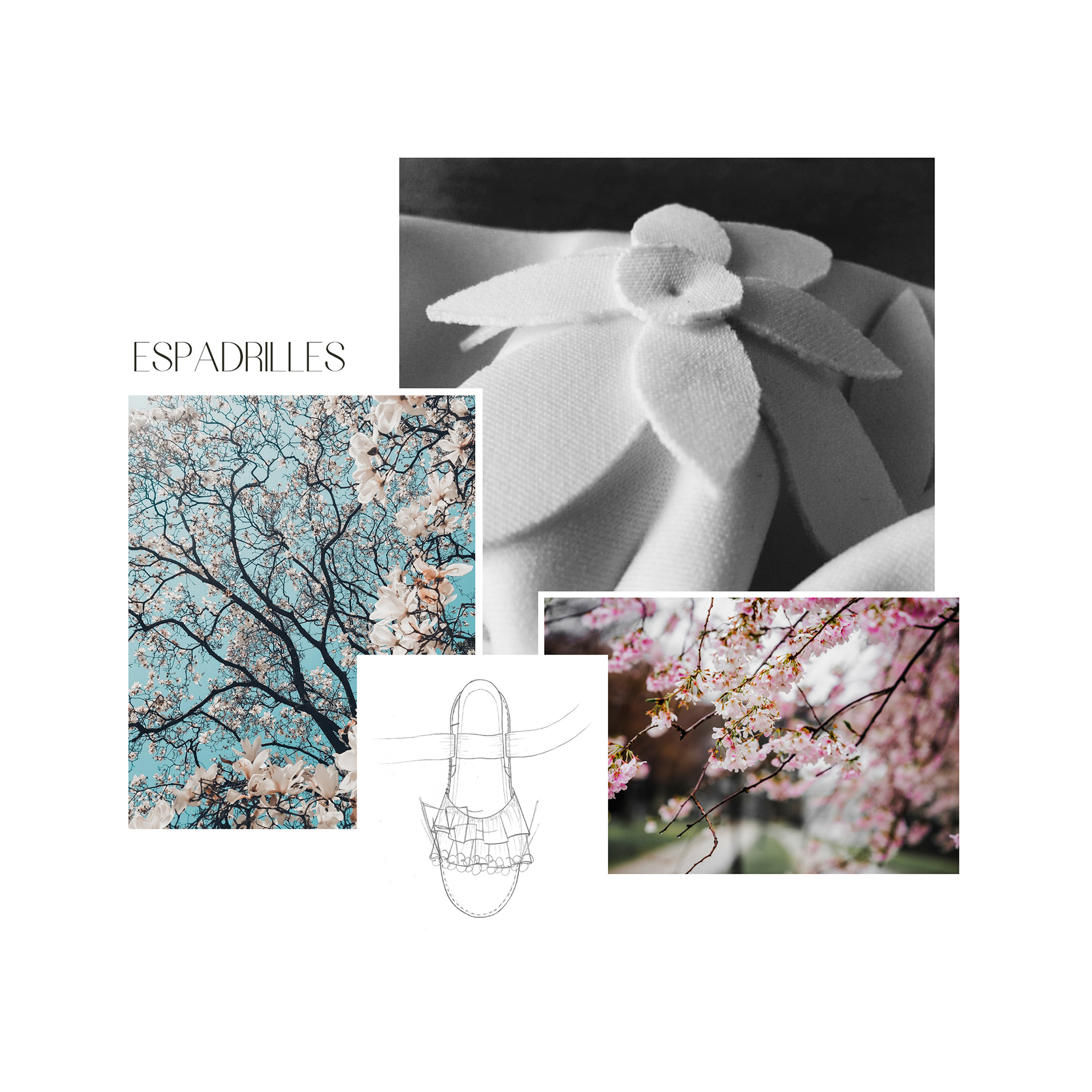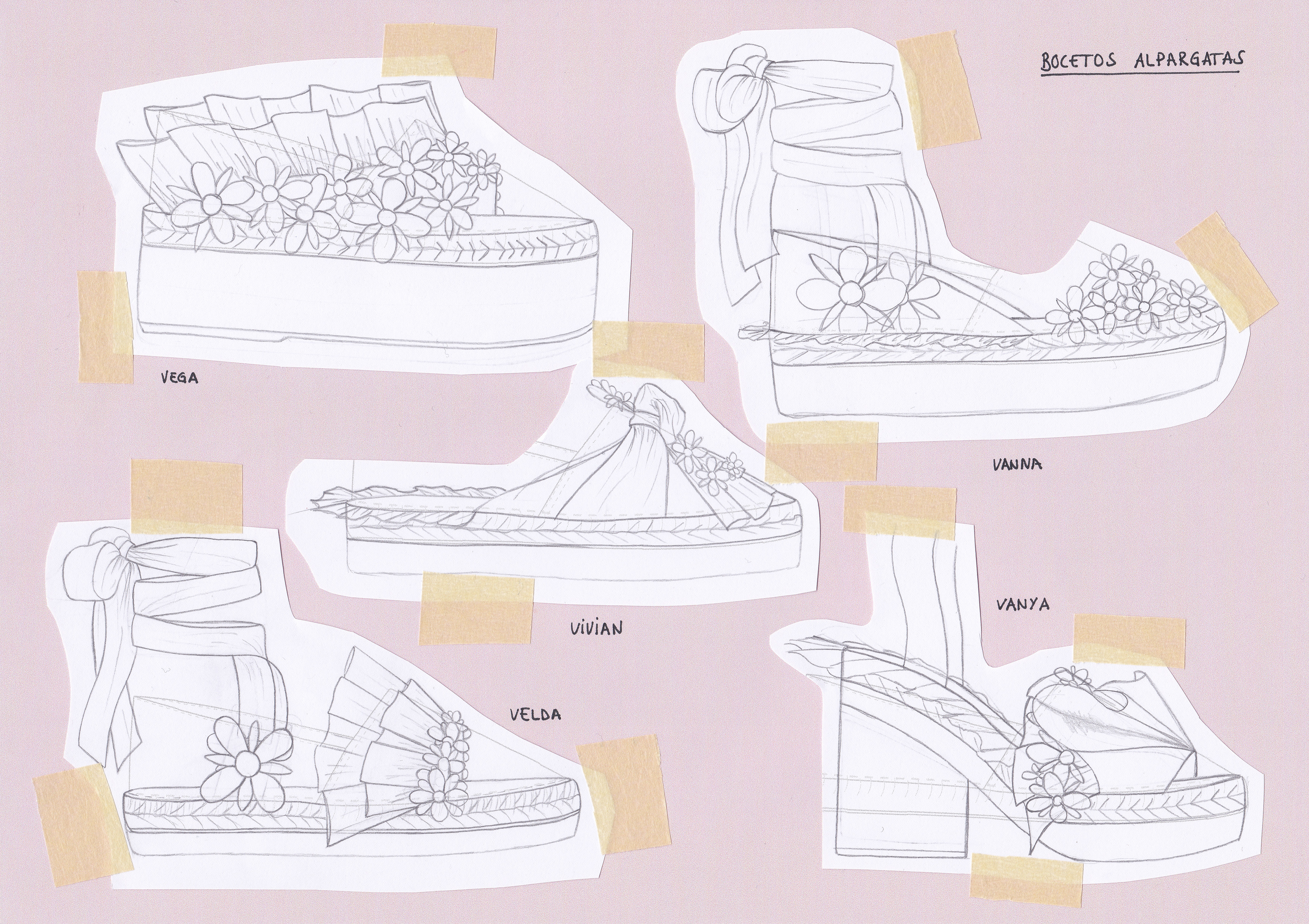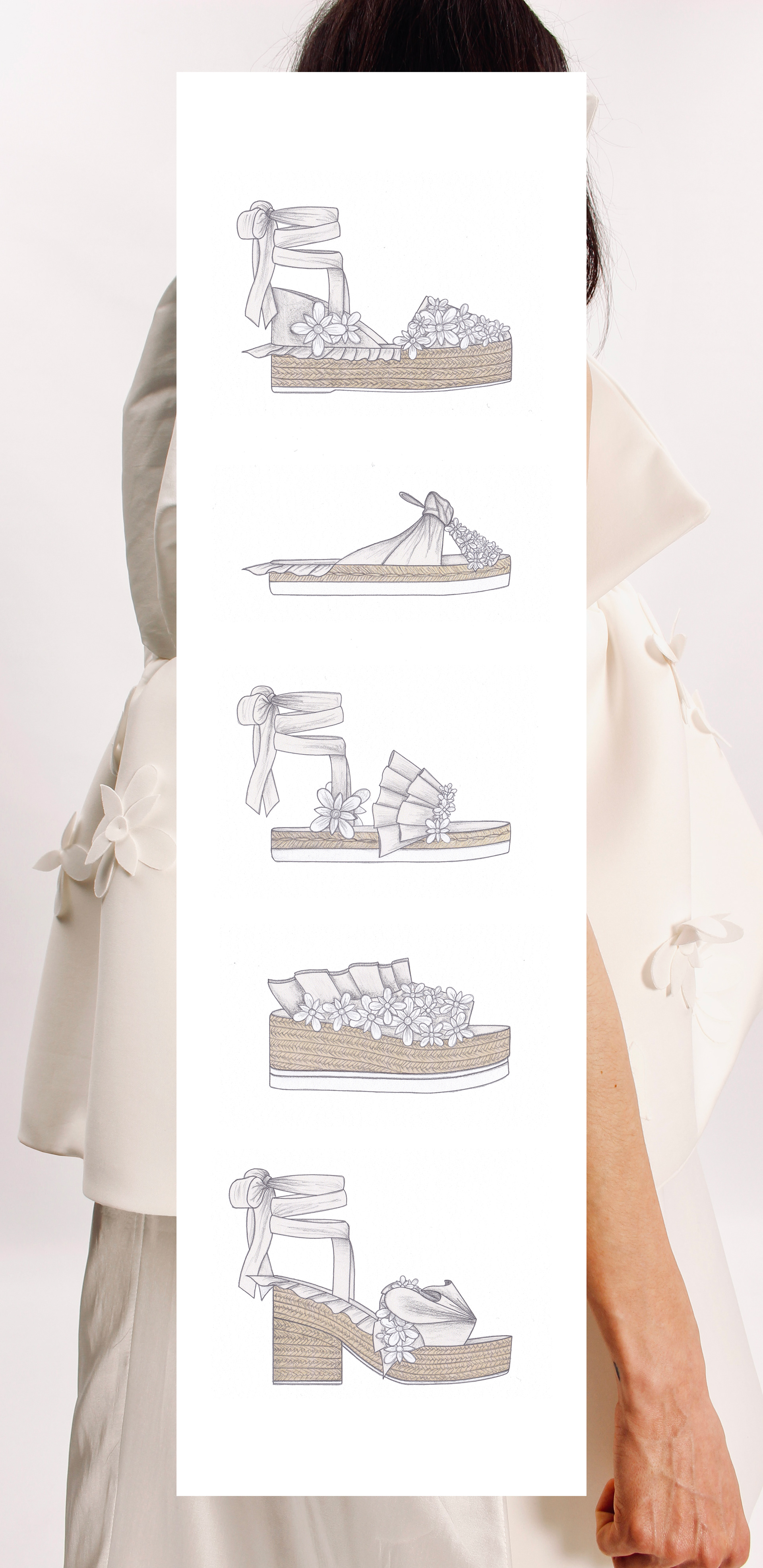 Shoe design collection made up of five espadrilles inspired by the "Growth Line - Verticality" capsule collection made of leather and neoprene fabric in white color.